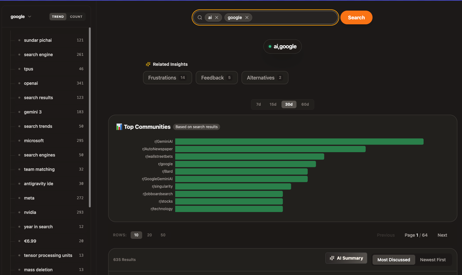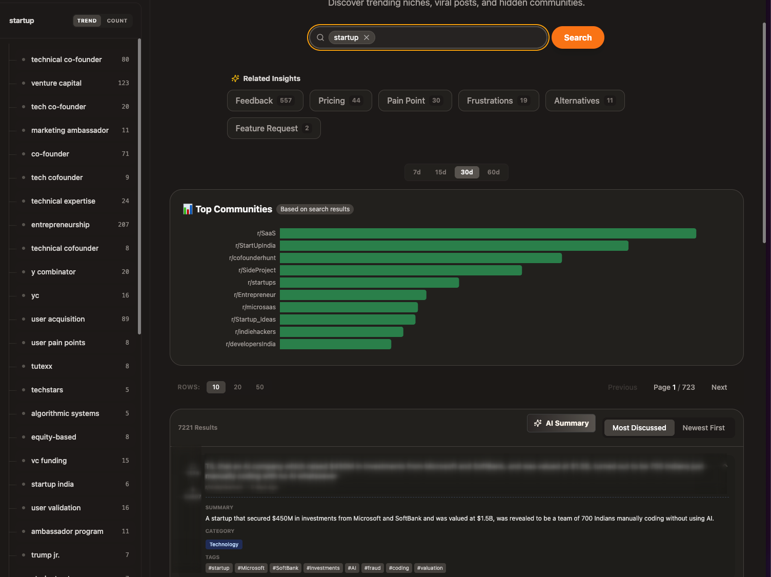 Time-Travel: Use our precision time filters (7d, 15d, 30d, 60d) to catch a trend while it's fresh, or look back to see what has staying power.