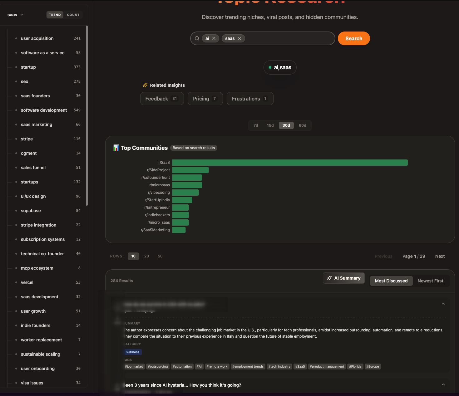 Great ideas don't exist in a vacuum—they live in communities. We built Topic Research to give you X-ray vision into what people are actually talking about, what they struggle with, and where they are spending their attention.